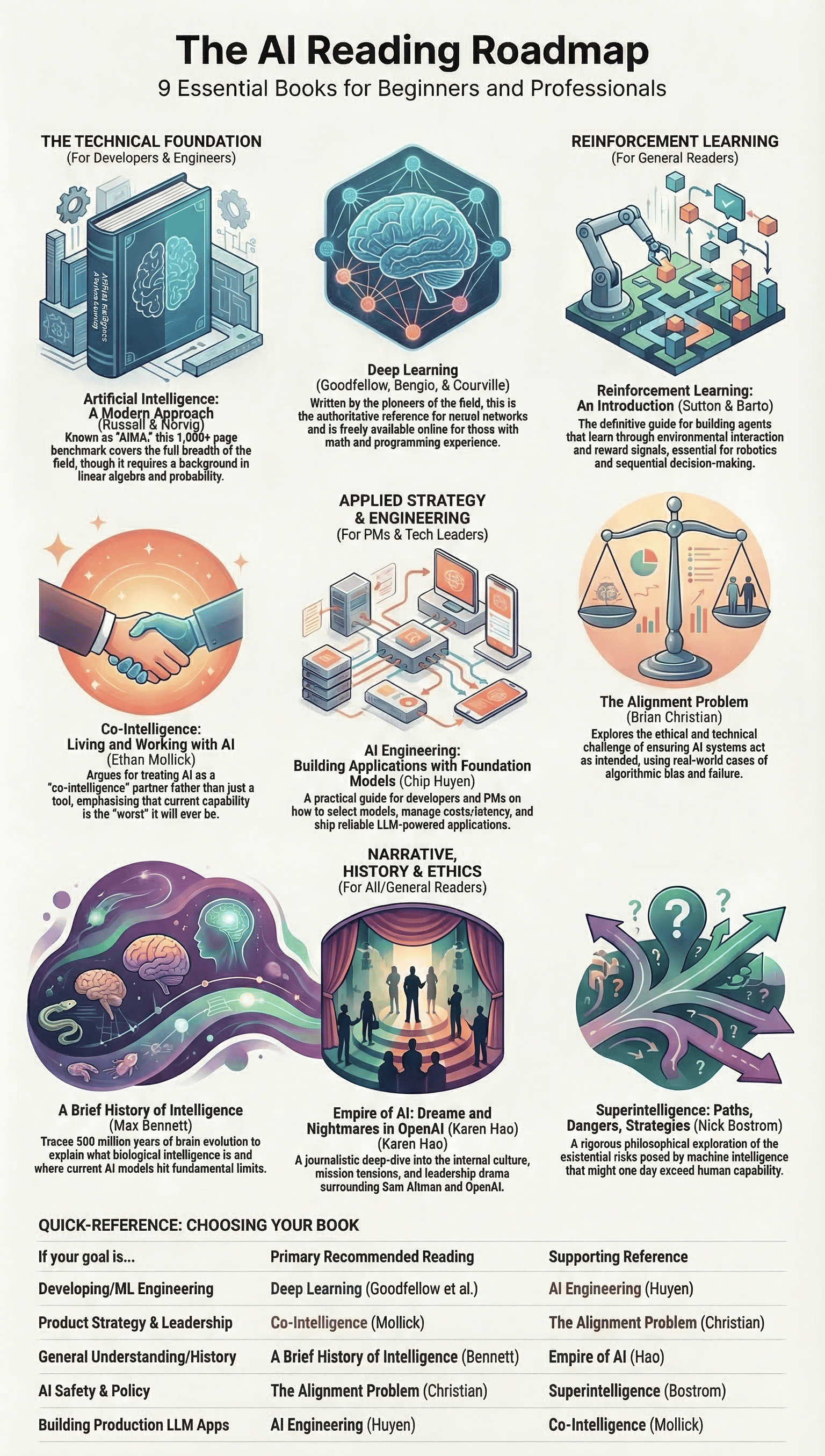 For technical readers who want the deepest possible foundation, Russell and Norvig provides the most comprehensive single-volume reference available, while Goodfellow, Bengio, and Courville provides the authoritative deep learning specialisation. Adding Huyen's engineering guide connects that theoretical foundation to the practical decisions involved in building production systems. For professionals and practitioners who need immediate workplace relevance, Mollick and Huyen are the highest-priority reads, with Christian's alignment book essential for anyone making deployment decisions that affect real users. For general readers, Bennett's evolutionary framing is the most unusual and intellectually rewarding entry point into the subject because it makes AI legible through biology rather than computation, Hao's OpenAI narrative provides the institutional and human context, and Mollick gives the practical orientation that makes the subject actionable.